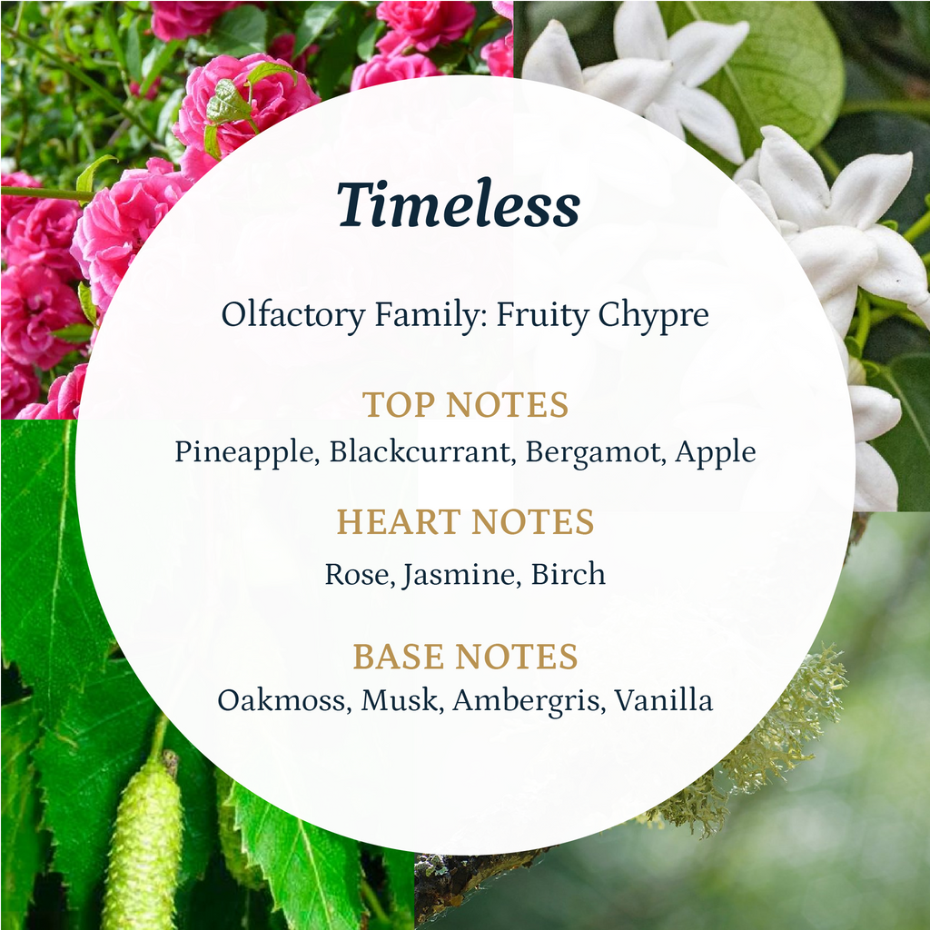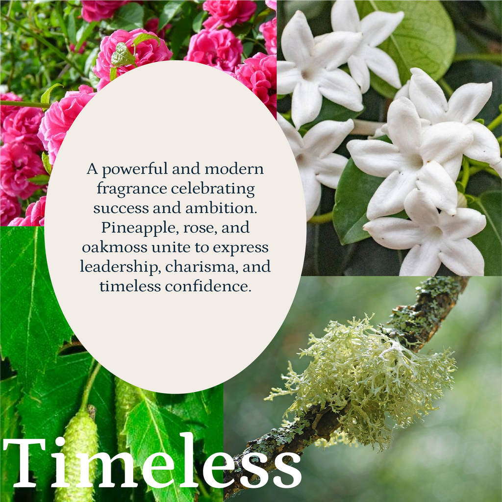 Description: Timeless is an embodiment of sophistication and power, designed for individuals who exude confidence and style. It opens with a burst of fresh, juicy pineapple combined with blackcurrant and bergamot, creating an invigorating and uplifting introduction. As the fragrance settles, it reveals a heart of smoky birch and jasmine, adding depth and sensuality to the composition. Patchouli, oak moss, ambergris, and vanilla form the base notes, lending a warm and inviting aura that lingers on the skin.