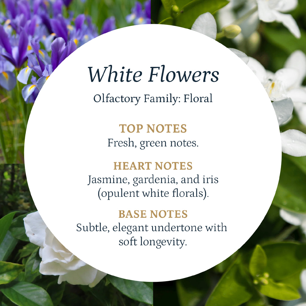 Immerse yourself in the elegance and purity of the scent of white flowers. This exquisite perfume evokes the delicacy of a garden in full bloom, where jasmine, gardenia and iris petals intertwine in a captivating olfactory symphony. Its fragrance begins with fresh and green notes, which gently unfold to reveal an opulent and creamy floral heart.