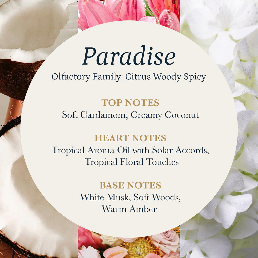 Citrus notes best make it to the woody base across the bridge of delicious spices of Paradise fragrance. A scent for all ages, fresh and familiar, what you smell is precisely what you get.