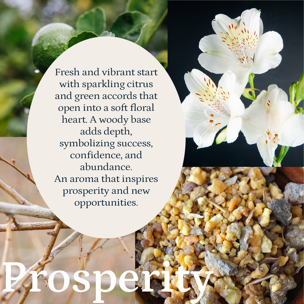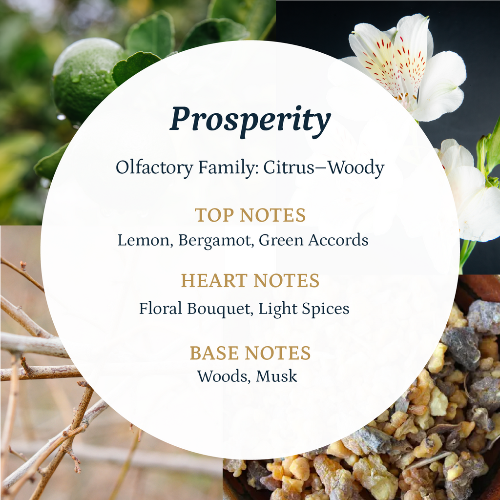 Prosperity is an appealing blend of green, earthy scents blended with spice. Its notes of lemongrass, green tea, and grapefruit, create a clean refreshing nature with a woody base that brings up a more serious tone.